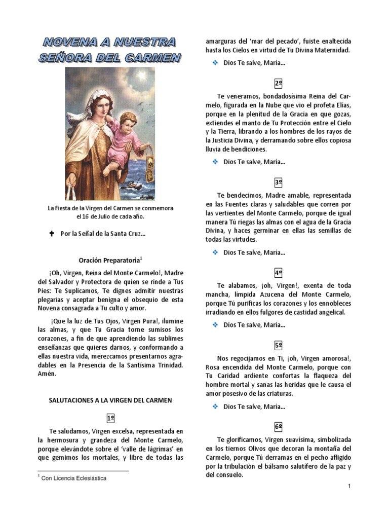 Si el que ruega, dice san anselmo, no merece ser oído, los méritos de maría, a la cual se encomienda, harán que sea escuchado. Rezo de la corona dolorosa. Novena a la virgen del carmen, oración para cada día. La autora se ha limitado a hacer la composición de los textos en forma novena. Virgen del carmen, maría santísima, que extendiendo tu amor hacia los carmelitas, aún después de la muerte, como piadosísima madre de los que visten tu santo escapulario consuelas sus almas, cuando están en el purgatorio, y con tus ruegos consigues salgan cuanto antes de aquellas penas, para ir a gozar de dios, nuestro señor, en la gloria. Puedes hacer la novena a la virgen del carmen tantas veces como desees, de manera especial los días previos a la festividad (7 al 15 de julio). Noveno día de la novena a la virgen del carmen por la señal de la santa cruz, de nuestros enemigos, líbranos, señor, dios nuestro. Oración a la virgen del carmen. Aqui otra oracion para la virgen del carmen. En colombia los conductores la adoptaron como la virgen de la protección en situaciones de peligros, si en estos momentos te encuentras en un estado de alerta, esta novena es la indicada para hacerle honor a la virgen del carmen. Todos los textos de esta novena a la virgen del carmen, a excepción de algunos himnos, han sido extraídos de la sagrada escritura, de la liturgia de la virgen del carmen y de los escritos de los santos del carmelo. Novena a la virgen del carmen. La de conocerte más y amarte mejor.